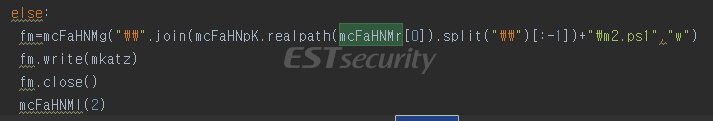 그리고 현재 실행 중인 경로에 미미카츠(mimicatz) 기능을 수행하는 ‘m2.ps1’ 파워쉘 파일을 드롭 및 실행합니다.
