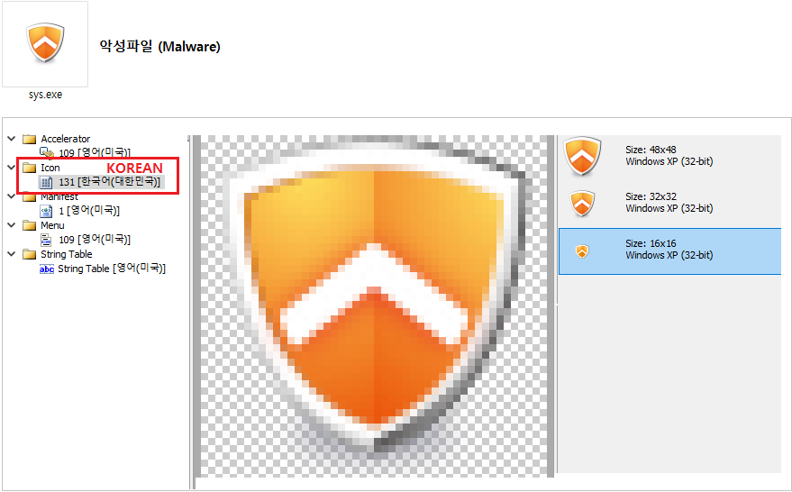 흥미로운 점은 공격자가 한국의 특정 보안 프로그램 아이콘 리소스를 변경하지 않고 계속 도용해서 쓰고 있다는 점입니다.
