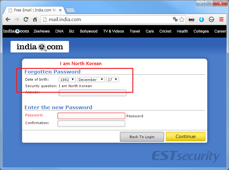 그리고 해커가 해당 이메일에 처음 가입할 때 적용한 암호 분실시 사용하는 보안 질문 설정에 다음과 같이 자신은 북한 사람이라는 영문 문장(I am North Korean)을 질문으로 설정해 두었습니다.