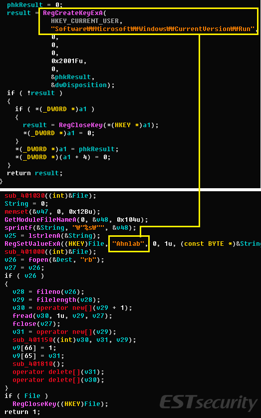 참고로 다운로드를 수행하는 숙주는 'Run' 레지스트리 경로에 마치 안랩 모듈로 위장하기 위해 'Ahnlab' 키로 자신을 등록합니다. 그러면 윈도우즈 운영체제가 재시작할 때마다 자동 실행되어, 공격자가 C2 서버에서 언제든지 변종을 유포할 수 있게 되며 잠재적인 위협요소도 작동하게 됩니다.
