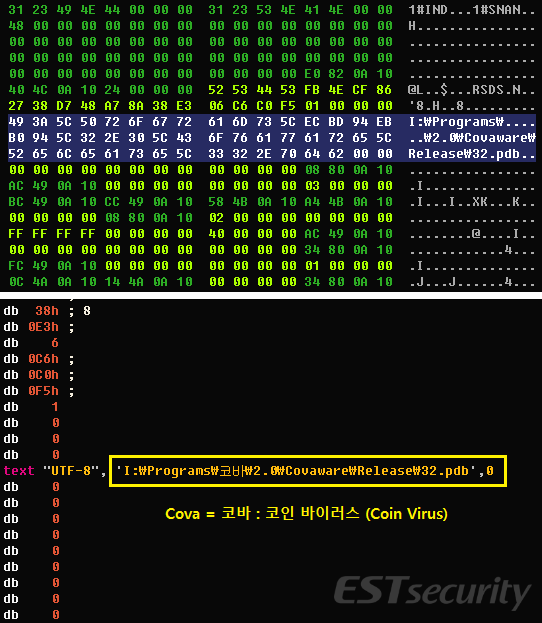 공격자가 사용한 코바(Cova)라는 표기는 '코'인 '바'이러스(Coin Virus)의 이니셜을 변환해 표현한 것으로 추정됩니다.