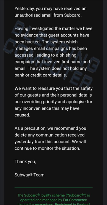 서브웨이의 시스템에서 발생한 ‘방해’와 관련해 몇 차례 이메일을 보낸 결과, 서브웨이는 회사의 이메일 캠페인을 담당하는 서버가 해킹되어 피싱 이메일을 발송했다고 밝혔습니다.