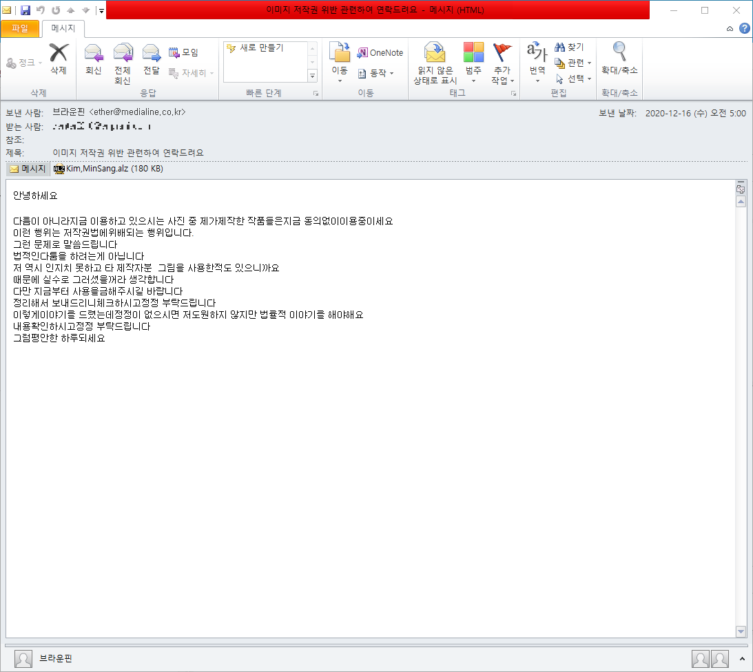 메일은 '자신의 작품을 동의 없이 사용하였고, 현재 저작권이 위반되는 사항이 있으니 해당 내용 확인하여 상의하자'는 내용과 함께 첨부파일을 포함하고 있습니다. 실제 첨부된 파일은 랜섬웨어 파일로 사용자에게 이메일 내용을 통하여 첨부 파일 실행을 유도합니다.