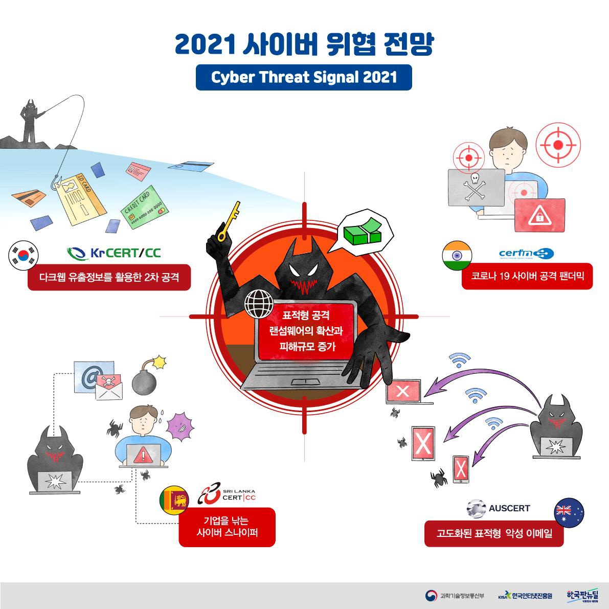 한국인터넷진흥원(KISA)는 사이버위협 인텔리전스 네트워크, 한국·스리랑카·인도·호주의 침해사고대응팀과 공동으로 2021년도 사이버 위협 전망을 발표했습니다.