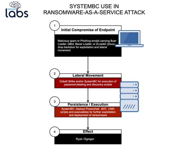 Sophos에서 발표한 새로운 분석에 따르면, Ryuk과 Egregor 랜섬웨어가 최근 배포 시 추가 페이로드를 로드하기 위한 네트워크 측면 이동을 위해 SystemBC 백도어를 사용한 것으로 나타났습니다.
