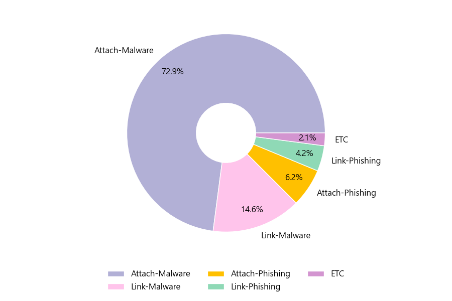 악성 이메일을 유형별로 살펴보면 48건 중 Attach-Malware형이 72.9%로 가장 많았고 뒤이어 Link-Malware형이 14.6%를 나타냈습니다.