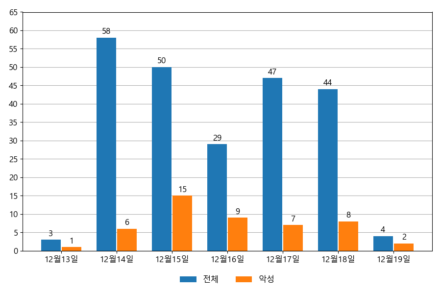 일일 유입량은 하루 최저 3건(악성 1건)에서 최대 58건(악성 15건)으로 일별 편차를 확인할 수 있습니다.