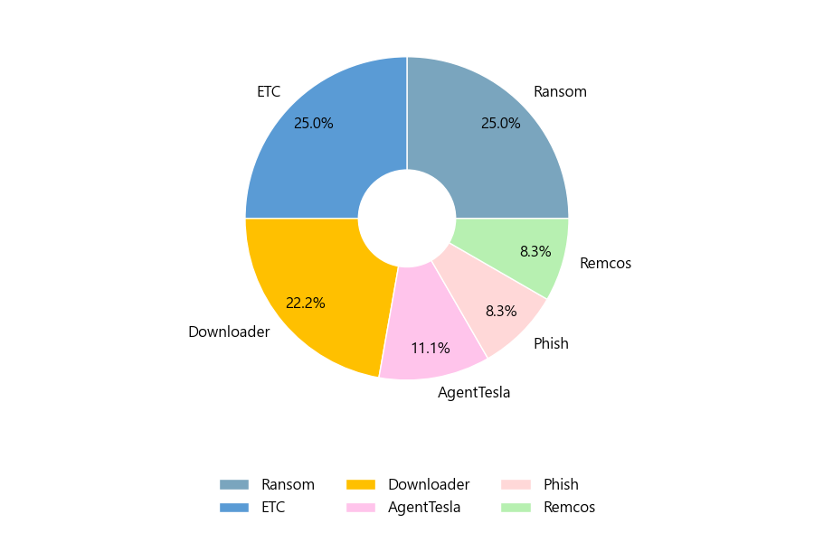 첨부파일은 ‘Ransom’형태가 25.0%로 제일 큰 비중을 차지했고 뒤이어 ‘ETC’, ‘Downloader’가 각각 25.0%, 22.2%의 비중을 차지했습니다.