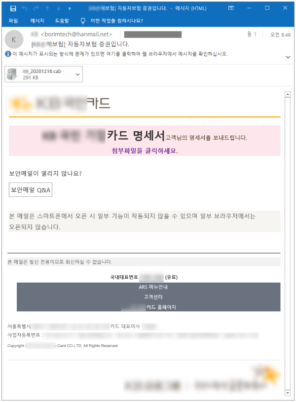이번주 Pick으로는 특정보험사를 사칭하여 악성코드를 유포한 이메일을 선정했습니다. 카드명세서를 보기위해 첨부파일을 클릭할 경우 원격제어툴(RAT)이 설치되기 때문에 주의가 필요합니다. 자세한 내용은 다음 글을 확인하시기 바랍니다.