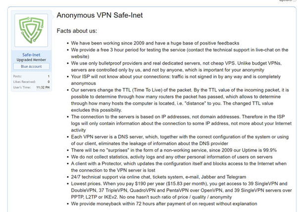 이 서비스는 러시아어와 영어를 지원하고, 10년이 넘는 기간 동안 활성화 되어 웹사이트 방문자에게 “방탄 호스팅 서비스”를 제공했습니다. 가끔 범죄자들의 세계에 터무니 없이 높은 가격을 제시하기도 했습니다.