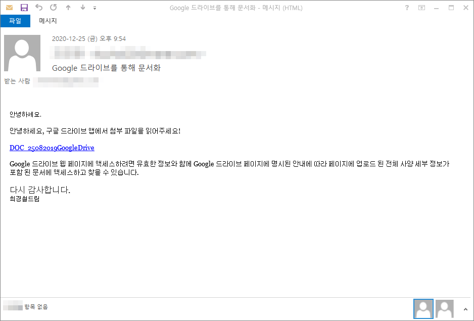 이번에 발견된 메일은 “Google 드라이브를 통해 문서화”라는 제목으로 수신되었으며, 문서를 확인하기 위해 구글 드라이브 앱에 첨부된 파일을 읽어달라는 허위 내용으로 수신자의 클릭을 유도하여 계정을 탈취하기 위한 목적으로 발송되었습니다.
