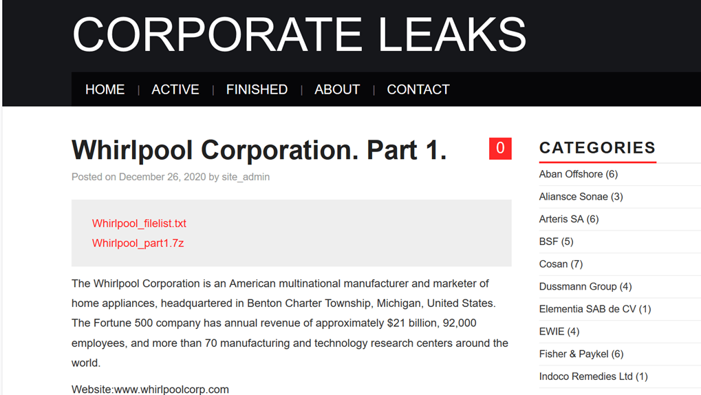 지난 주말 동안, Nefilim 랜섬웨어 운영자들은 월풀의 데이터 중 일부를 공개했습니다.