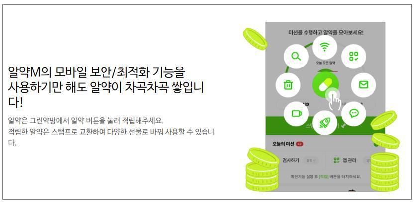 ‘알약M’은 이제 스마트폰 악성코드 검사와 치료, 메모리-배터리 최적화, 파일 청소, 스미싱 문자 탐지, 메신저 파일 정리 등 다양한 폰 케어 서비스를 제공할 뿐만 아니라 사용자 스마트폰의 보안 점검과 관리 습관을 확인할 수 있는 포인트 적립 서비스도 제공할 수 있게 되었다.