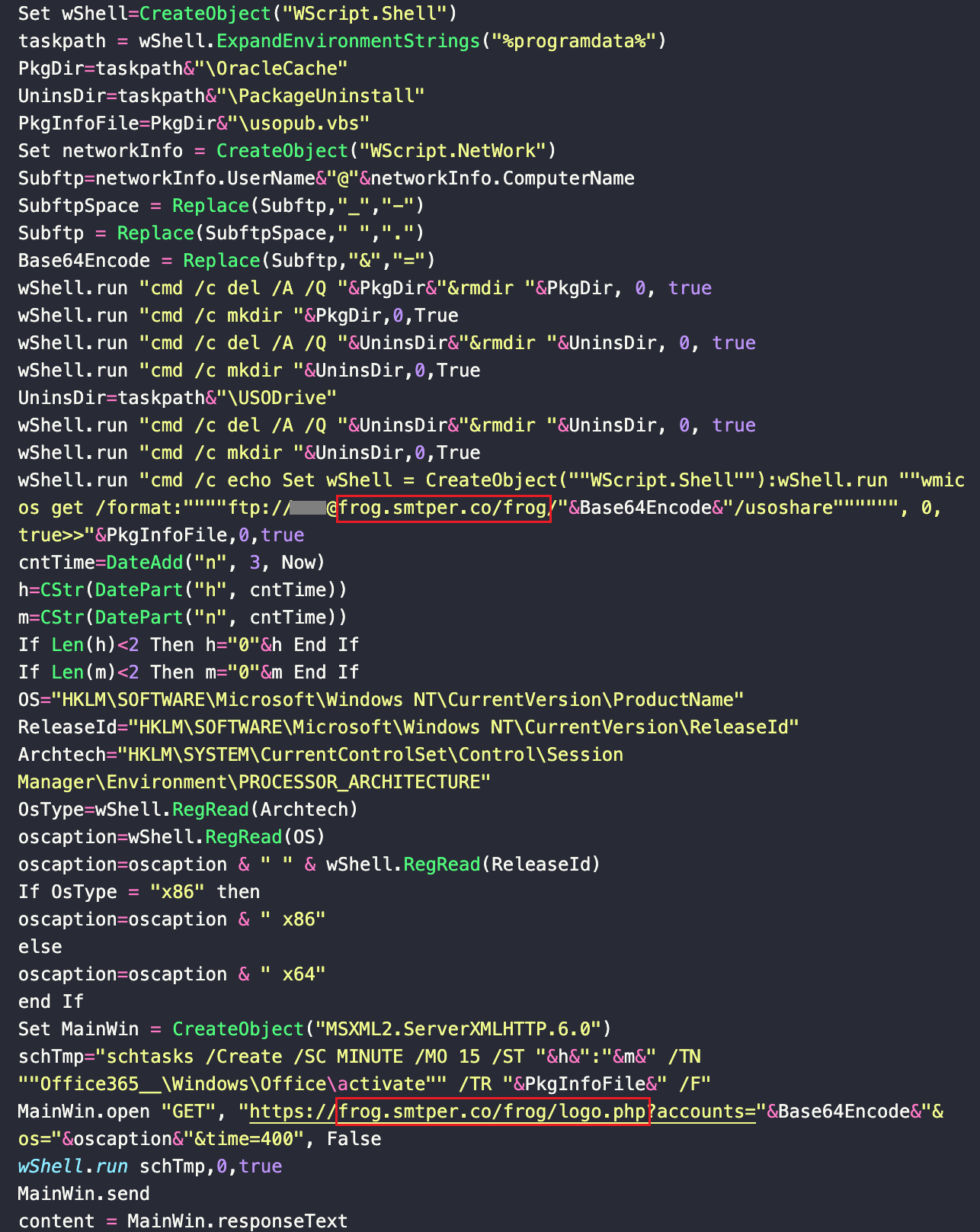 추가로 받아지는 파일은 VBS 명령어 기반으로 실행되며, %ProgramData% 하위 폴더에 'OracleCache', PackageUninstall', 'USODrive' 등을 생성합니다. 그리고 'frog.smtper[.]co' 서버로 접속해 추가 명령을 수행합니다.