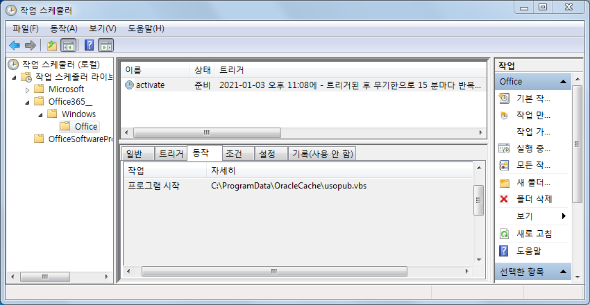 그리고 작업 스케줄러에 'Office365__' 라이브러리를 등록하고 하위에 [Windows\Office] 경로에 'activate' 이름으로 15분 간격으로 반복실행하는 트리거를 설정합니다.