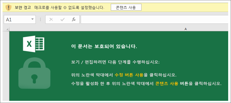 ESRC에서는 동일한 기법을 사용하는 악성 문서 파일도 발견했습니다. 이 파일은 마치 보호된 문서처럼 화면을 조작했고, [콘텐츠 사용] 버튼 클릭을 유도합니다.
