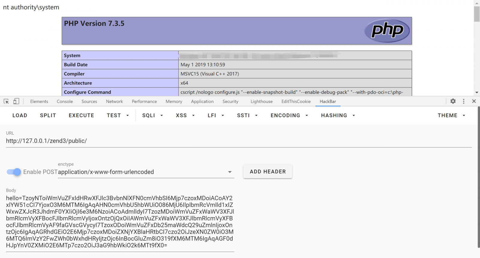 해당 연구원은 PoC 익스플로잇에서 해당 웹 애플리케이션의 phpinfo 페이지가 직렬화된 HTTP 요청을 통해 전달된 그의 시스템 명령인 "whoami"를 어떻게 성공적으로 파싱했는지, 그리고 "nt authority\system" 윈도우 계정명을 리턴했는지 시연해 보였습니다.