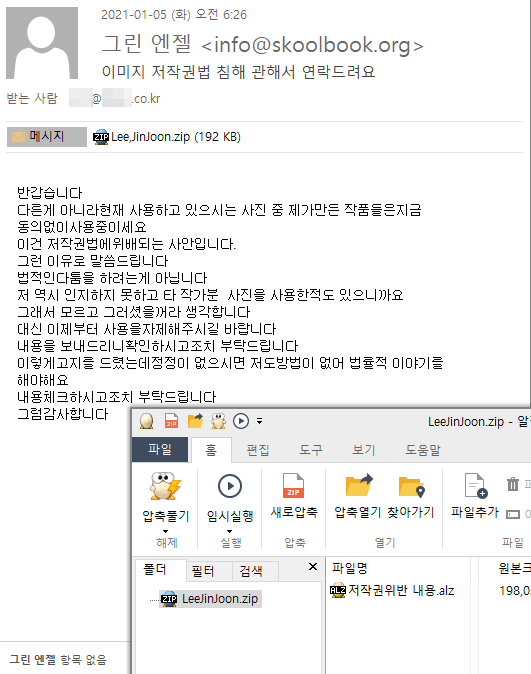 따라서 저작권이라는 민감한 소재로 사용자들에게 첨부파일을 실행시키도록 유도하기 때문에 불분명한 파일 실행을 하지 않는 등의 사용자들의 각별한 주의가 필요합니다. 또한 중요한 파일들은 정기적으로 외장 매체(USB, 외장HDD) 등에 백업해두는 습관이 필요합니다.