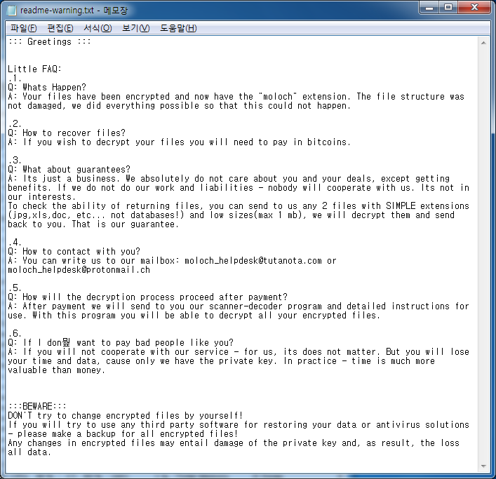 Makop 랜섬웨어는 파일 암호화 기능을 수행하는 악성코드로 암호화된 파일 뒤에 [임의 영문 8자리].[moloch_helpdesk@tutanota.com].moloch를 추가하고, 이후 복호화 안내를 위해 ‘readme-warning.txt’를 드롭합니다. 아래는 makop 랜섬웨어의 랜섬노트로 ‘moloch_helpdesk@tutanota.com’, ‘moloch_helpdesk@protonmail.ch’ 메일로 연락해달라는 내용을 담고 있습니다.