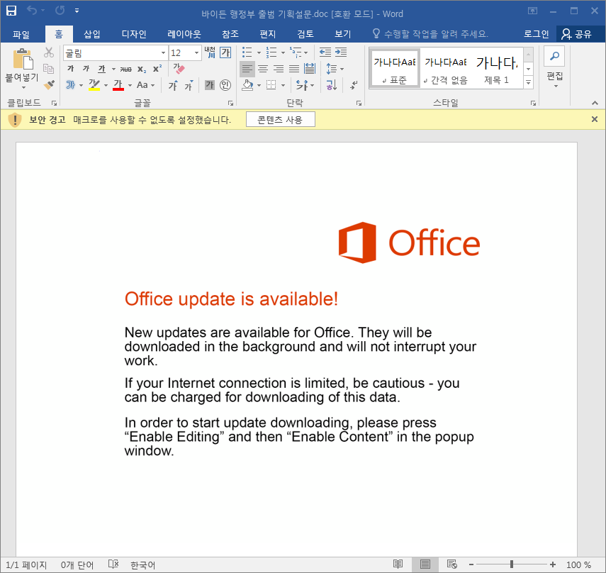 악성 DOC문서가 처음 실행되면 악성 매크로 기능을 허용하도록 오피스 업데이트로 가장한 허위 영문 메시지를 띄어 [콘텐츠 사용] 버튼을 클릭하도록 유도했습니다. 만약 이용자가 해당 내용에 현혹되어 [콘텐츠 사용] 버튼 클릭을 누르면, 매크로에 포함된 악성 명령이 동작하게 되어 예기치 못한 해킹 피해로 이어질 수 있게 됩니다.