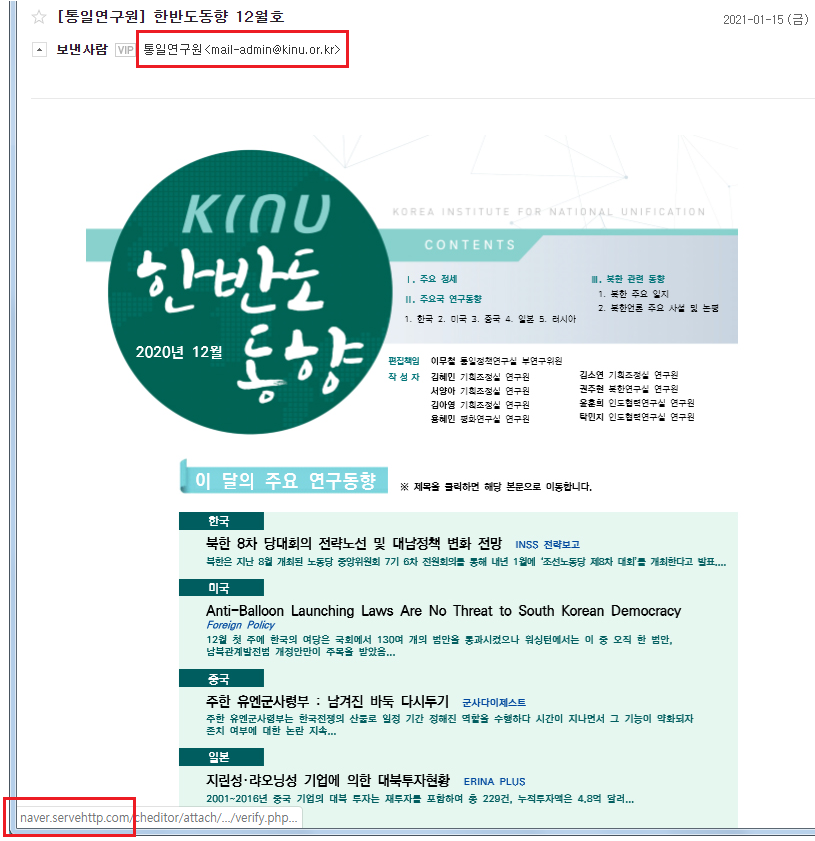 더불어 동일한 공격 조직들은 지난 금요일 ‘통일연구원’ 발신지처럼 정교하게 조작해 대북 분야 전문가 상대로 해킹 이메일을 대거 유포했는데, 본문에 포함된 연구동향 이미지를 클릭할 경우 특정 피싱 서버 ‘naver.servehttp[.]com’ 주소로 접속해 이메일 암호 입력을 유도합니다. 만약 이용자가 암호를 입력할 경우 공격자에게 탈취되고, 정상 PDF 문서가 다운로드 되어 피해 사실을 인지하지 못하게 만드는 전략을 구사하고 있습니다.