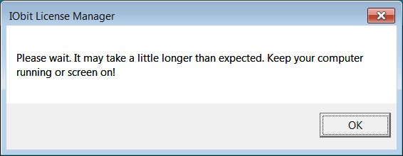 이 랜섬웨어는 IObit License Manager에서 표시하는 것이라 주장하는 메시지 창을 표시합니다. 메시지의 내용은 “기다려 주시기 바랍니다. 예상한 것 보다 시간이 더 오래 걸릴 수 있습니다. 컴퓨터를 계속 켜 두거나 스크린 화면을 켜 두시기 바랍니다!”였습니다.
