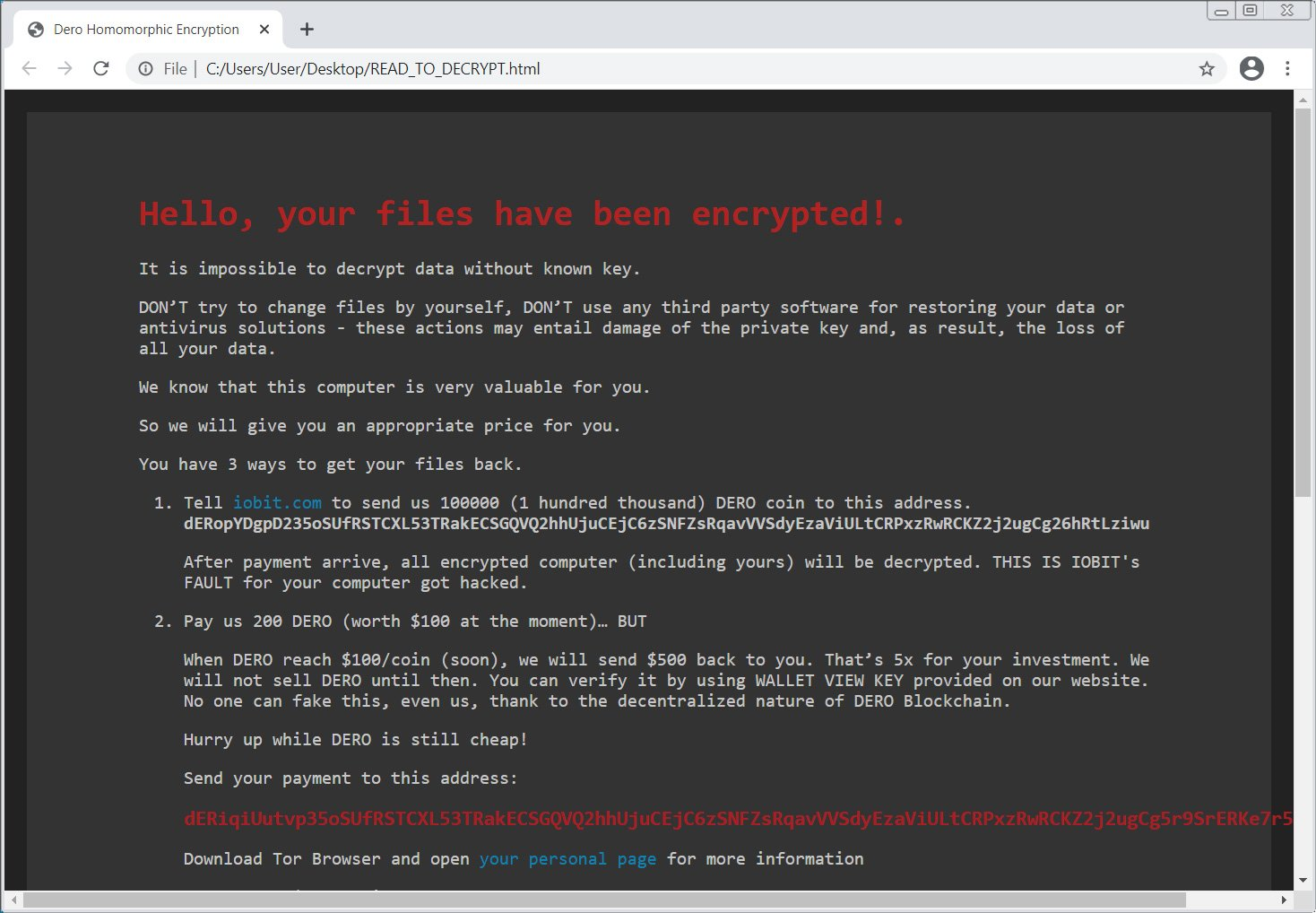 특이하게도, 이 Tor 사이트는 IObit에서 10만 달러 상당의 DERO 코인을 공격자에게 보낼 경우 모든 피해자를 복호화해 주겠다는 메시지를 포함하고 있었습니다.