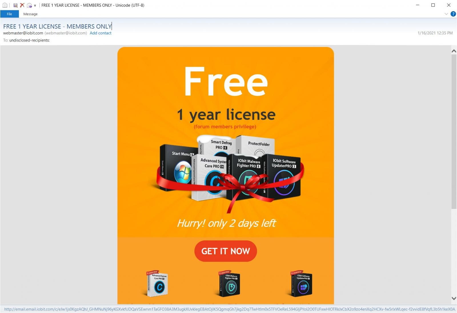 지난 주말, IObit 포럼 회원들은 IObit에서 발송한 것으로 위장한 이메일을 받기 시작했습니다. 1년 무료 라이선스를 지급한다는 내용이었습니다.