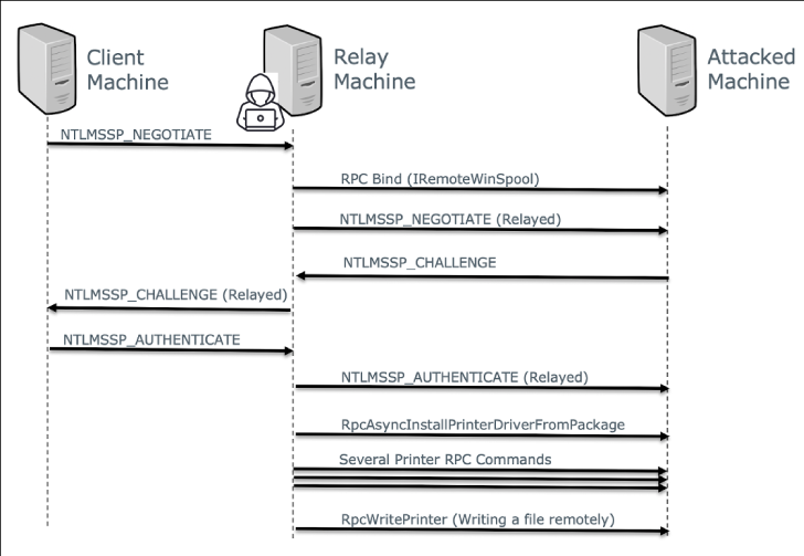 연구원들은 원격 프린터 스풀러 관리 RPC 인터페이스인 IRemoteWinspool를 악용하여 일련의 RPC 작업을 실행하고, NTLM 세션에 인터셉트하여 타깃 기기에서 임의 파일을 쓸 수 있다는 것을 발견했습니다.
