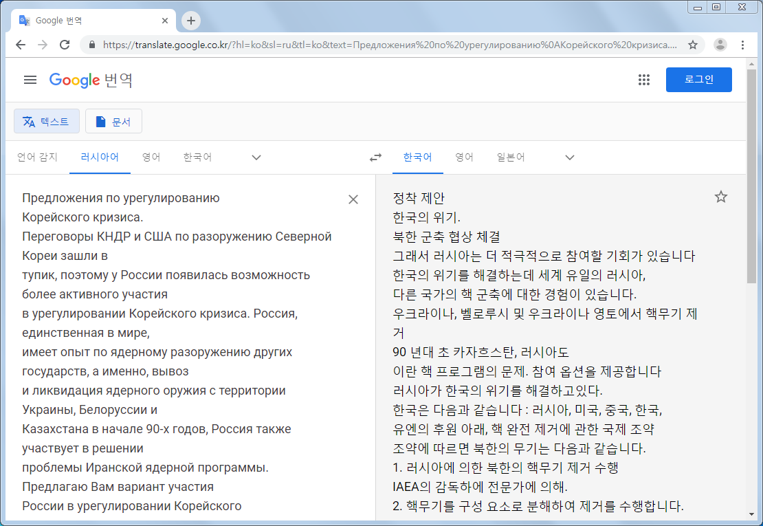 해당 PDF 문서의 러시아어 내용을 구글 번역으로 확인하면 다음과 같으며, 한국의 위기라는 내용이 보여지게 됩니다.