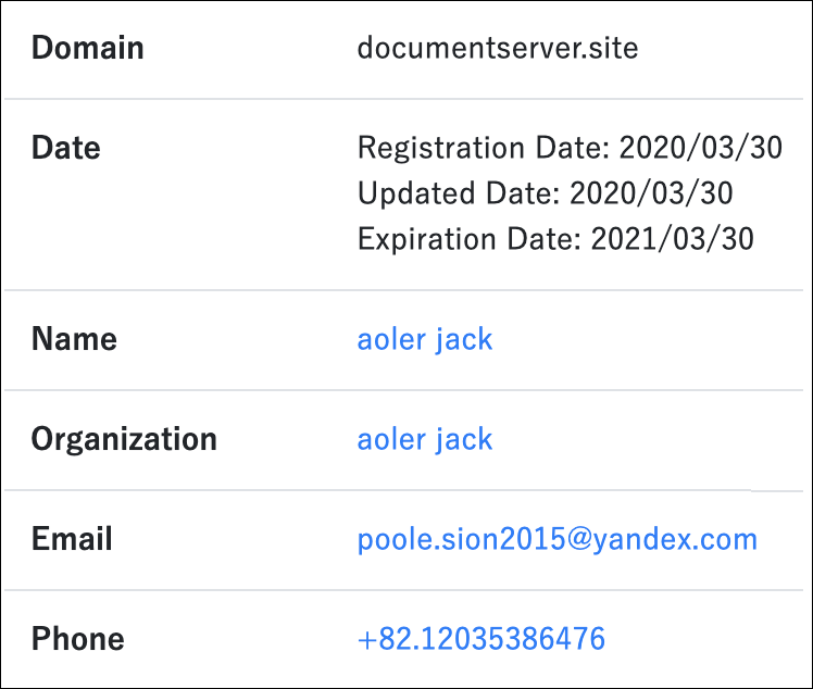 해당 도메인의 등록날짜는 2020년 03월 30일이고, 등록자명은 'aoler jack' 입니다. 그리고 등록에 사용된 이메일은 'poole.sion2015@yandex.com' 러시아 주소가 사용됐습니다.