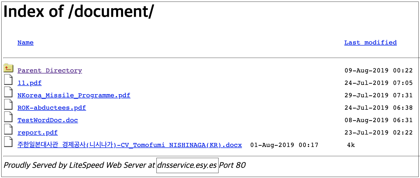 2019년 당시 'dnsservice.esy[.]es' 서버에는 공격자가 다양한 미끼 파일을 등록해 사용했는데, 주로 남북한 문서가 사용됐고, 일부 파일은 추후 교체되기도 합니다.