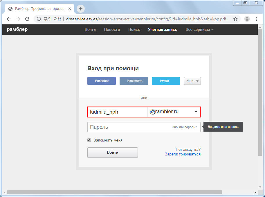 정교하게 조작된 가짜 로그인 화면에는 'ludmila_hph@rambler.ru' 이메일 주소가 지정되어 있고, 검색을 통해 실제 존재하는 인물의 계정임을 알 수 있습니다.