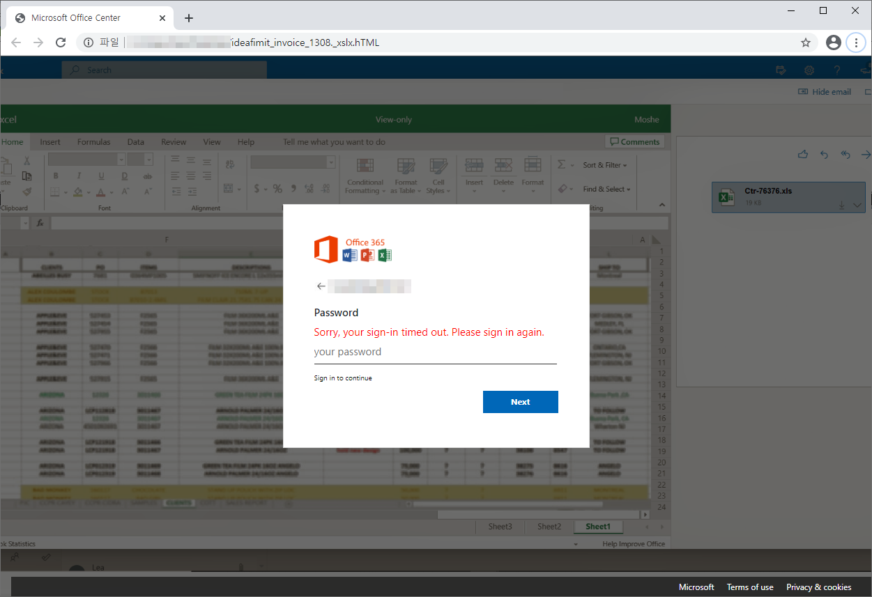 사용자는 견적 확인을 위해 첨부 된 파일을 다운로드하여 실행할 경우, 수신자의 계정과 패스워드를 가로채기 위한 피싱 페이지가 브라우저를 통해 연결됩니다.