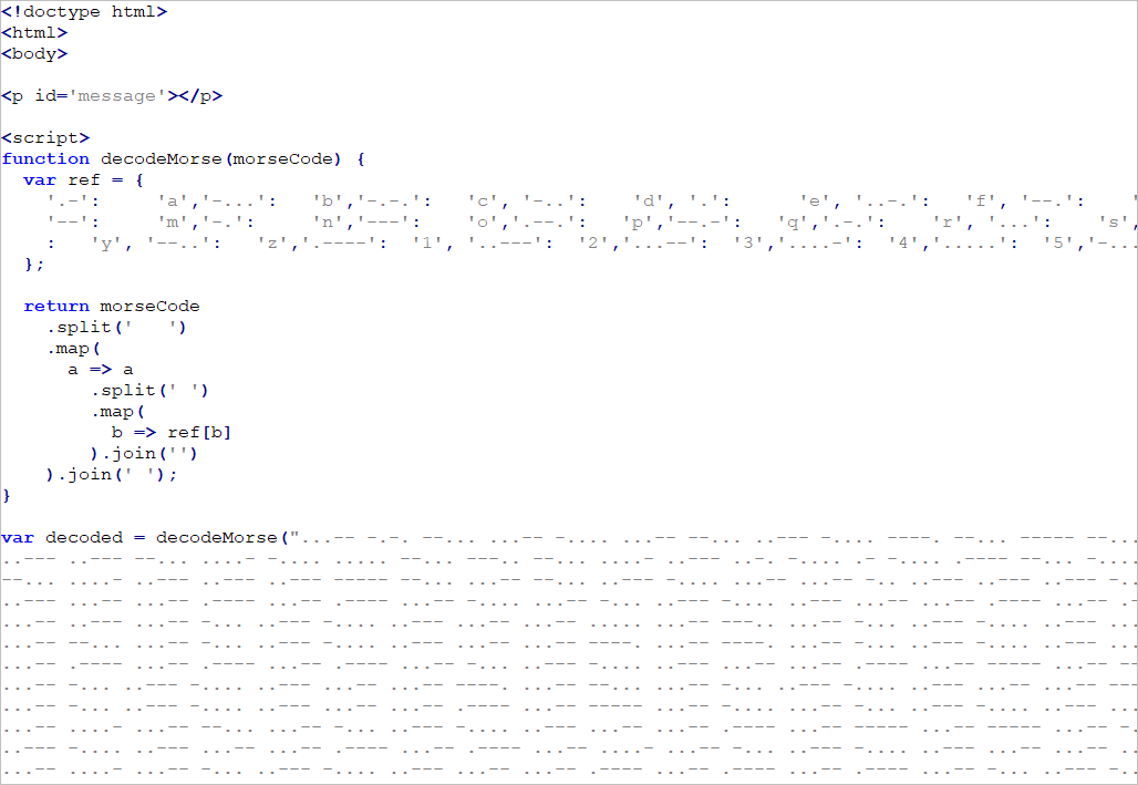 모스(Morse) 코드로 난독화된 스크립들은 특정 함수를 통해 모스코드 문자열들이 16진수로 디코딩되며, 최종 디코딩된 스크립트 코드는 아래와 같습니다.