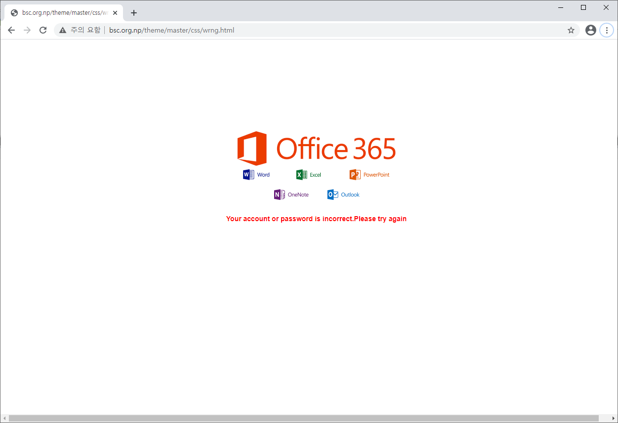 사용자가 피싱 페이지에 계정과 패스워드 정보를 입력할 경우 모두 개인 정보 수집 사이트로 전송되며, 이후 패스워드가 틀린 것처럼 보이는 페이지를 사용자에게 보여줍니다.