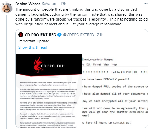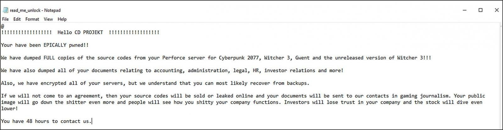 “신원이 확인 되지 않은 공격자가 내부 네트워크에 무단으로 접근해 CD Projekt 그룹의 데이터 중 특정 부분을 수집했으며 랜섬노트를 남겼습니다. 네트워크 내 일부 기기는 암호화되었지만, 백업 파일은 남아있습니다. 이들은 IT 인프라를 보호하고 데이터 복원을 시작했습니다.”