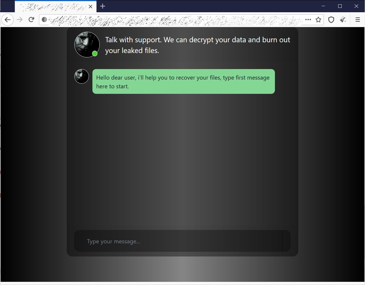 랜섬노트에는 피해자가 랜섬웨어 운영자와 협상할 수 있는 Tor 다크웹 URL이 포함되어 있습니다. 이 URL은 피해자마다 다르게 생성되며 공격자와 대화할 수 있는 간단한 채팅 인터페이스를 포함하고 있었습니다.