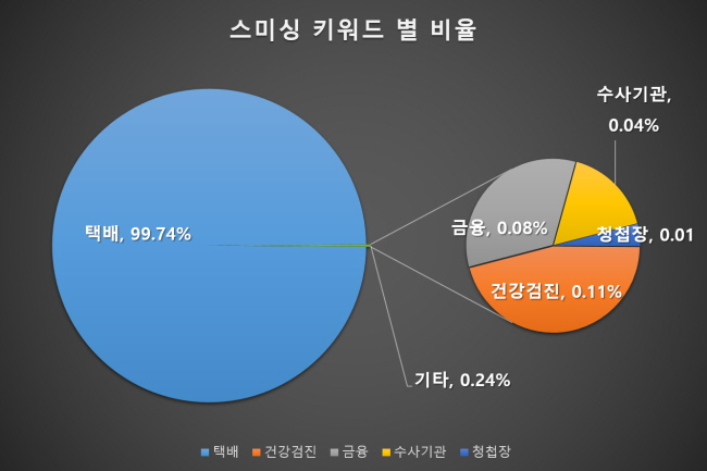 그림을 살펴보면 지난 12월과 마찬가지로 1월 한 달간 이루어진 스미싱 공격의 대부분은 택배 스미싱에 집중되어 있음을 알 수 있습니다. 택배 스미싱이 전체의 99.7%를 차지하고 있습니다.