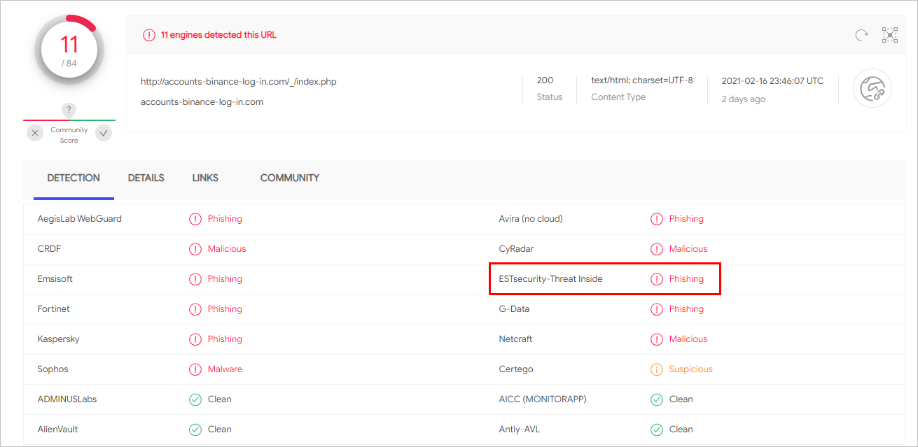 현재 이스트시큐리티 ‘쓰렛 인사이드(Threat Inside)’에서는 해당 피싱 사이트를 아래와 같이 탐지하고 있습니다.