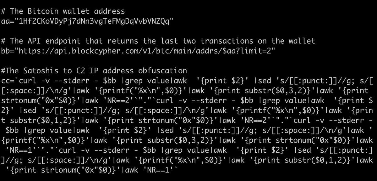 “이 감염은 지갑 주소를 DNS와 같은 기록으로 사용하며 트랜잭션 값을 A 레코드 유형으로 사용합니다. aa 변수는 비트코인 주소를 포함하고 있으며, bb 변수는 IP 주소를 생성하는데 사용된 최근 두 트랜잭션을 리턴하는 API 엔드포인트를 포함하고, 변수 cc는 변환 프로세스가 완료된 후 최종 C2 IP 주소를 포함합니다.”