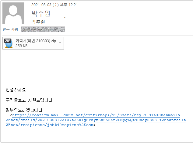 이번주 Pick으로는 이력서로 위장해 랜섬웨어를 유포하는 이메일을 선정했습니다. 이번 이메일은 첨부파일에 암호가 포함되어 있어 백신 탐지가 안되고 있으며, 실수로 클릭할 경우 랜섬웨어가 설치되오니 주의가 필요합니다. 관련된 내용은 다음 글을 확인하시기 바랍니다.
