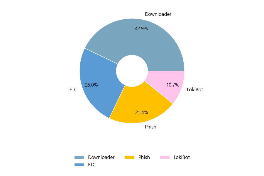 첨부파일은 ‘Downloader’형태가 42.9%로 제일 큰 비중을 차지했고 뒤이어 ‘ETC’, ‘Phish’가 각각 25.0%, 21.4%의 비중을 차지했습니다.