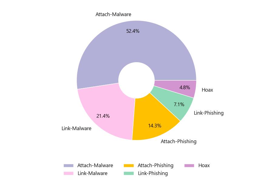 악성 이메일을 유형별로 살펴보면 42건 중 Attach-Malware형이 52.4%로 가장 많았고 뒤이어 Link-Malware형이 21.4%를 나타냈습니다.