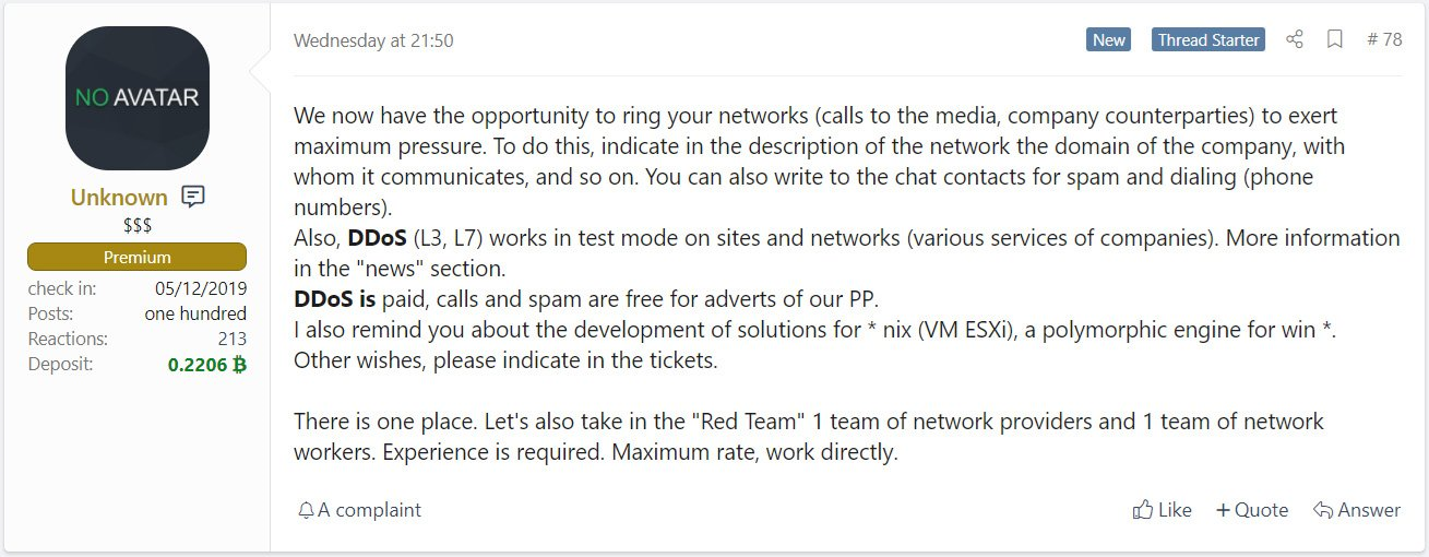 또한 Sodinokibi는 제휴 파트너가 3 계층 및 7 계층 DDoS 공격을 수행할 수 있는 유료 서비스를 제공하고 있습니다.