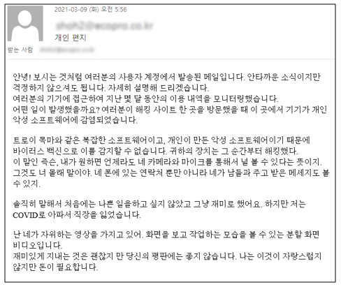 작성된 내용을 살펴보면, 수신자가 접속했던 성인 사이트에서 악성코드 감염이 발생했고, 이를 통해 사생활이 녹화된 동영상을 획득하였으니 이를 유포하기 전에 금전을 보내라는 식으로 수신자를 협박하고 있습니다.